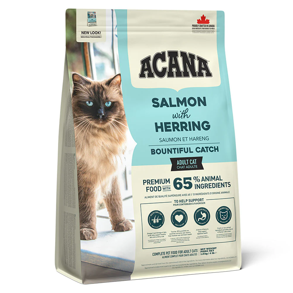 Specially crafted with a bounty of fish, our ACANA™ Bountiful Catch Recipe satisfies your cat with rich fish ingredients. Rich with 65% quality animal ingredients* including raw salmon and whole herring, Bountiful Catch has the animal protein your cat needs to be their best. This nutrient-dense recipe also helps support key health benefits for your cat, including healthy skin & coat, healthy heart & eyes and digestive health. Nurture your feline with a fish-forward recipe tailored to keep them healthy and happy with ACANA Bountiful Catch!