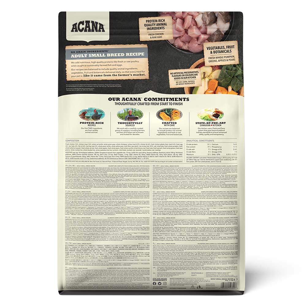 When it comes to ACANA™ food for dogs, we’re obsessed with every ingredient that goes into our premium recipes made in Canada. That’s why our Adult Small Breed Recipe is thoughtfully crafted to nurture your small breed dog with plenty of animal protein to meet their energy needs. Made with 60%* quality animal ingredients like fresh chicken and raw hake balanced with 40%* fruit and vegetables** like fresh whole pumpkin, greens, apples and pears, this recipe provides the nutrition and animal protein your small breed dog needs to live their best life. These wholesome ingredients are provided by suppliers we know and trust, and our vets and pet nutrition experts carefully craft each recipe with the goal of making your pet feel so good inside, you’ll see it on the outside.