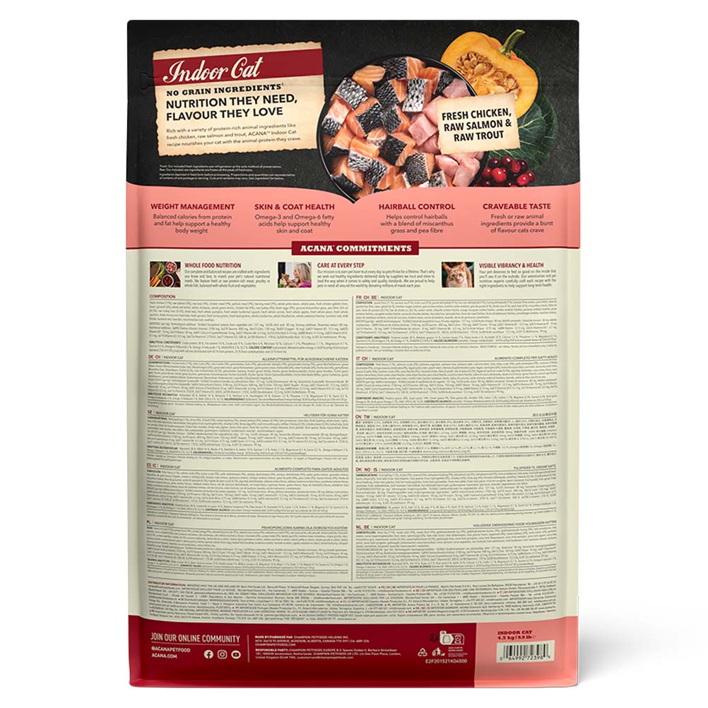 benefits, including balanced protein and fat to help them maintain a healthy weight. A blend of fibre help support hairball control and Omega-3 and Omega-6 fatty acids help support a healthy skin and a shiny coat. Nourish your indoor cat’s cravings with ACANA Highest Protein Indoor Cat recipe!